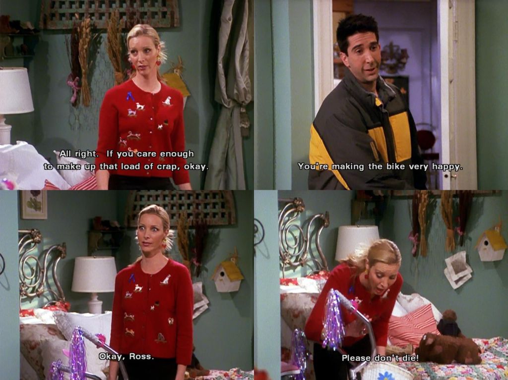 Of course, my favorite part of “The One with All the Candy” is Phoebe and Ross’ storyline, where he buys her a bike, and the above picture is so perfectly Phoebe that it always makes me smile. But I actually like Monica’s plot, too – where she’s making Christmas candy for the whole building – and her exchange with Chandler is probably one of the best of the episode.