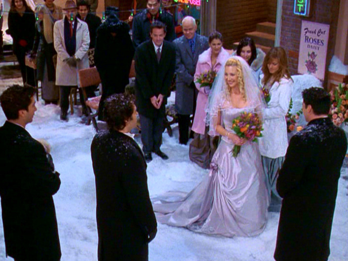 Although Phoebe’s wedding wasn’t as iconic as Ross and Emily’s London wedding, as long-awaited as Monica and Chandler’s, or as socially groundbreaking as Carol and Susan’s, it is definitely the one that speaks to me the most. The wedding ceremony was perfect, and if I ever get married again, I want something like it. Phoebe’s dress? OMG. The steel drums, the snow, the lights? Seriously. The vows? Make me cry. I literally love it all, even the snow, and I’m pretty much completely anti-precipitation in all forms.