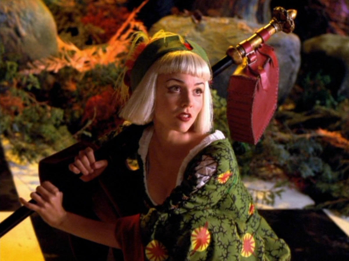 I, of course, have to mention the amazing costumes, all based on Rider-Waite tarot cards, which I didn’t catch that on my first viewing. Granted, I knew nothing about tarot cards back in 1997 – 1998, so that’s to be expected. Callisto as The Fool is just perfect, too, symbolically and sartorially. Hudson Leick looks adorable here!