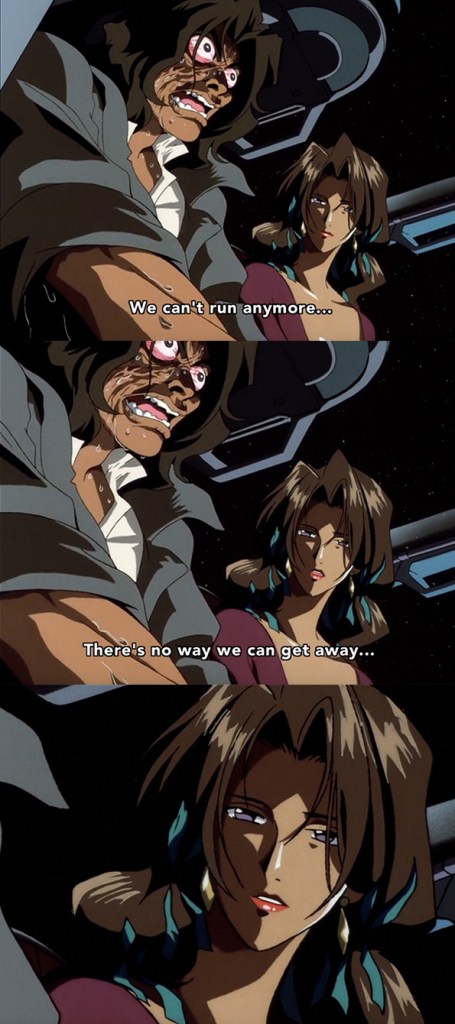 I’m sure there are other memorable bounties, but this one just really hit me with how good this show was. It was the late 90s when Cowboy Bebop came out, and I’m not entirely sure what the economic environment was in Japan at the time, but I think it’s safe to say that many Japanese knew that type of desperation and what it drove people to do to survive. Desperation provides the opportunity for very poor decisions, and Asimov clearly has made some big ones here: stealing the entire supply of a very potent drug from a crime syndicate, using the drug to fight off anyone who would chase him, and then trying to sell it, thinking that if it’s all gone, the syndicate will just, like, let them live on Mars? He pays the price, but he also drags Katerina down with him, although she’s the one who sees the truth of everything: they will never achieve her dreams, and she made the mistake to trust and love a man controlled by addiction and greed. So she kills him and essentially commits suicide, floating away in space. It’s a tragically poetic ending to their short spree. Basically? It’s the little people who suffer the most, and that is definitely a theme throughout the series.