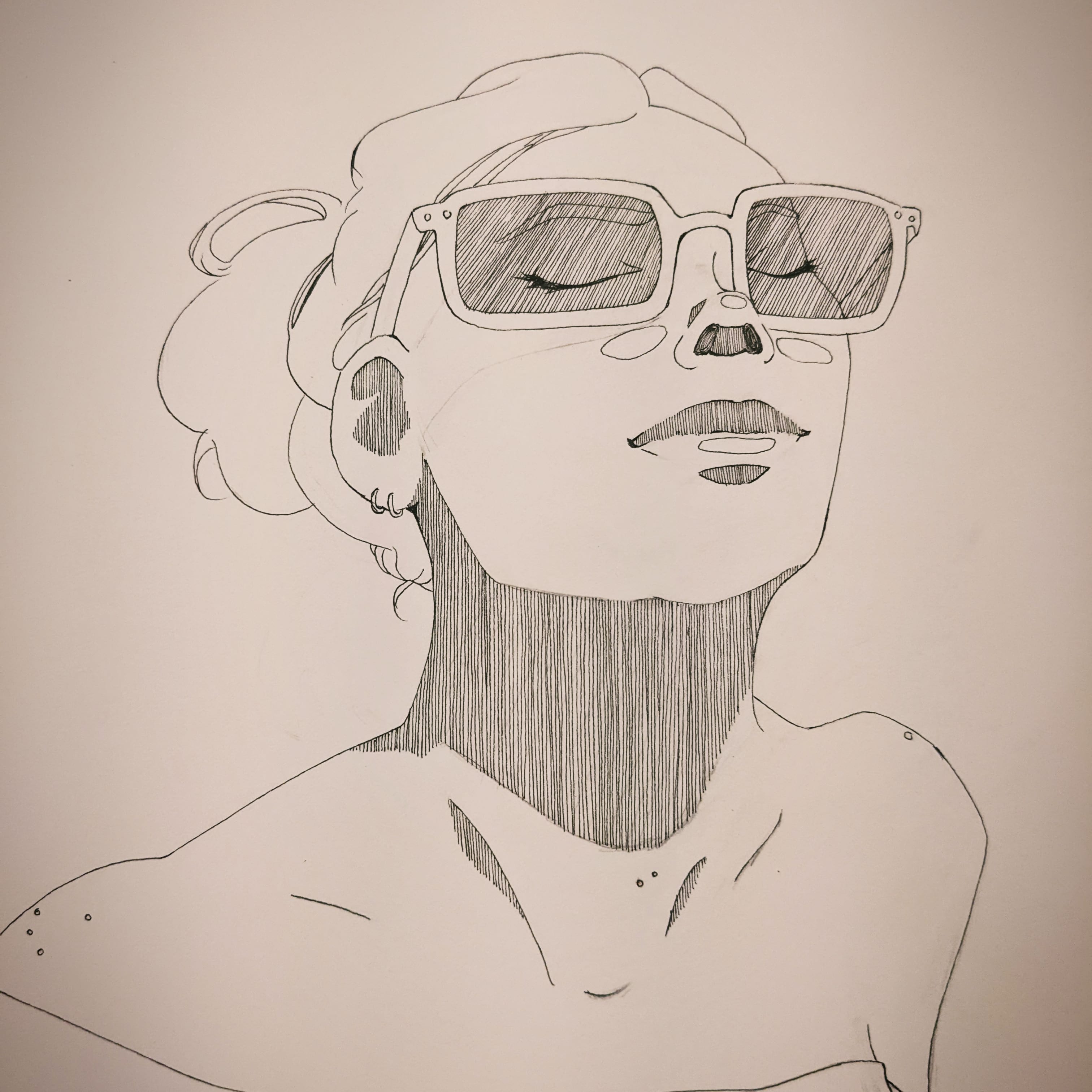 The line drawing wasn’t my favorite, especially the nose because 1) the proportions were all off and 2) I unintentionally put lines on the top and bottom of the shaded area. I also hated the sunglasses, since I never, ever draw them, and the hatching was … not great. But hey, it wasn’t that bad, I supposed. Onto the painting process.