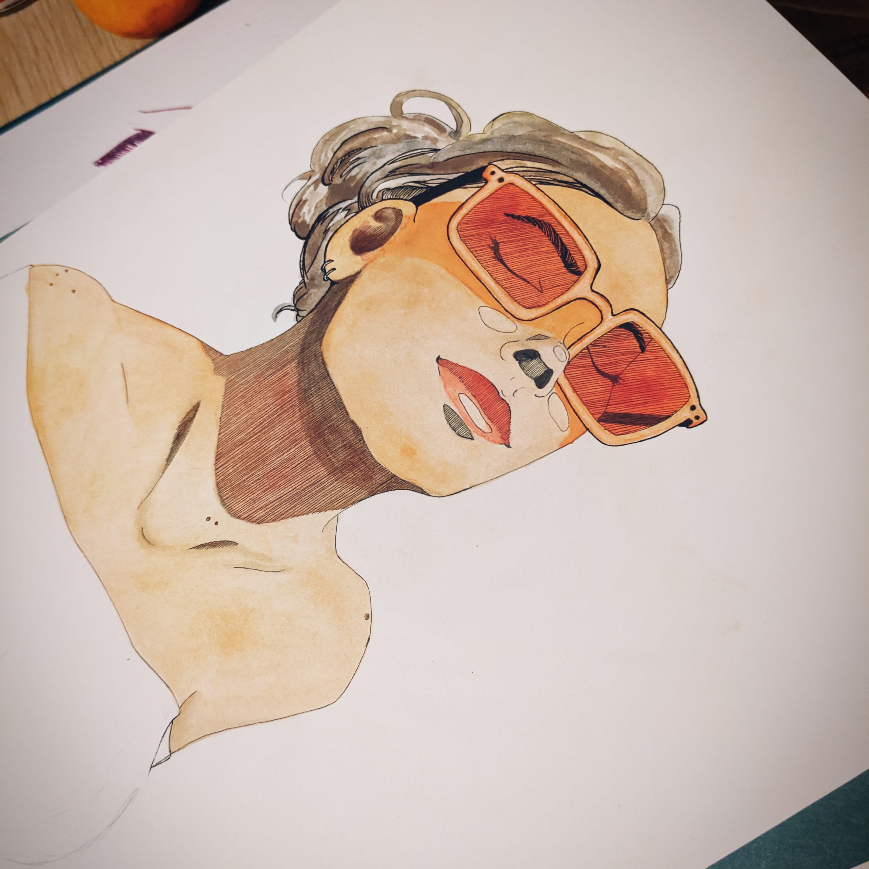 Once I added watercolor, things went south. I don’t have a picture of it because, well, I was ashamed at my apparent lack of skill, but let’s just say, her complexion looked like she was a Grey, only with a bit of peach added. But! Instead of freaking out and just ripping it to shreds, I tried layering a more yellowish light brown, and I ended up with what didn’t look terrible. It still wasn’t my favorite thing I’d created, but at least I wasn’t having a creative existential crisis. And somehow the sunglasses became my favorite part? Growth.